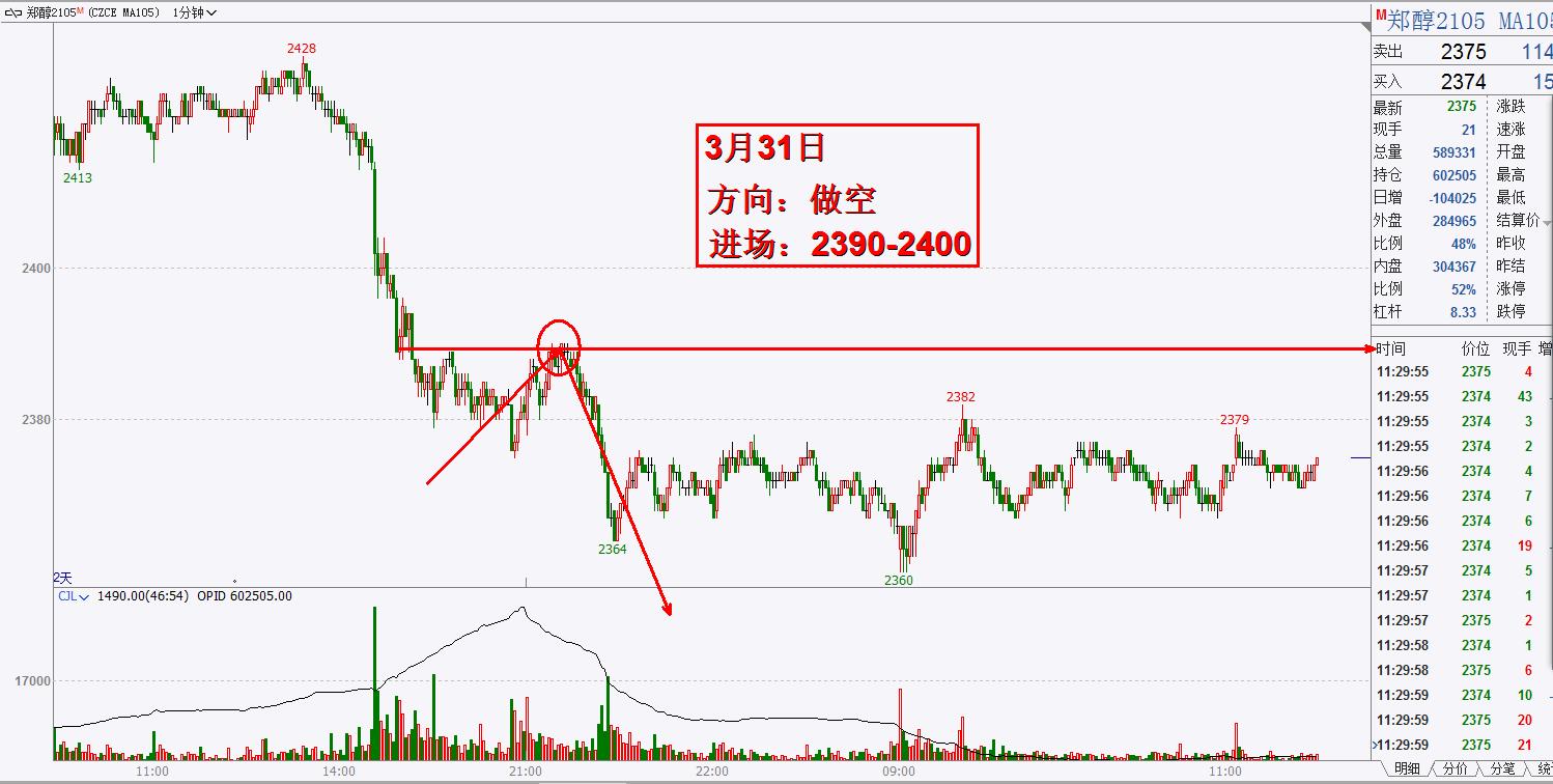 2、午盘策略回顾,甲醇05合约2390-2400附近进场做空,晚间价格最高上冲2390附近,触及进场价格,最低回落2360附近,单笔无杠杆收益1.3%