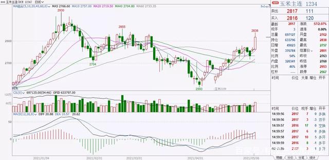 国内方面,国际玉米大涨、涨停、飚高的极端行情,也提振国内市场的看涨氛围。5月7日,玉米主力合约周五飙升,冲上2800元关口,盘中最高达2838元/吨,周涨幅高达3.07%。