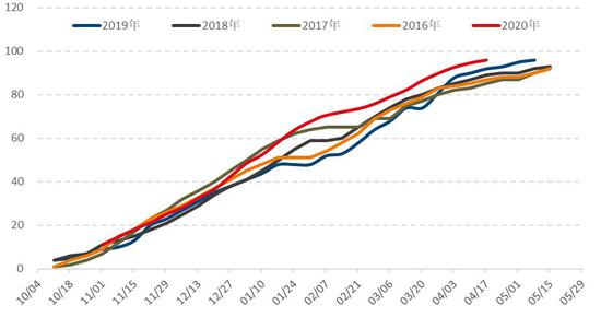 根据天下粮仓的统计来看,2020/21市场年度全国玉米销售进度快于往年,截至4月16日,全国玉米销售进度达到95.73%,处于过去五年中最高水平。其中华北完成94.2%,东北完成97.26%。4月以来随着基层农户潮粮销售的结束及部分小贸易商的出货完成,短期供应压力得到释放,后期持粮主体的心态趋于稳定,出货节奏也将放缓。