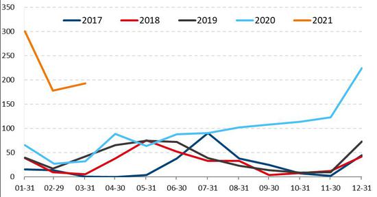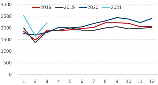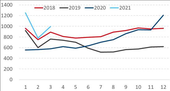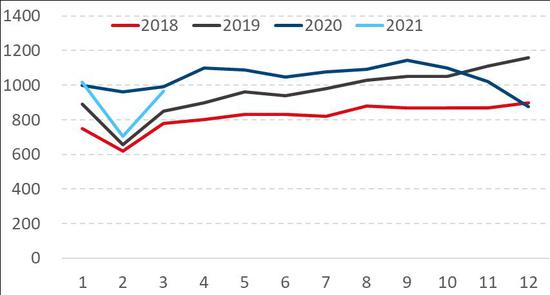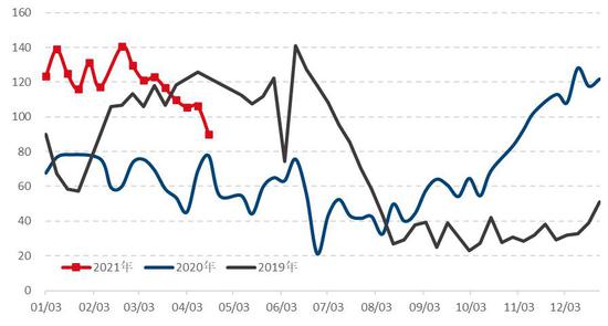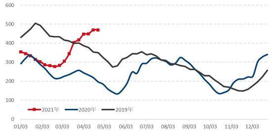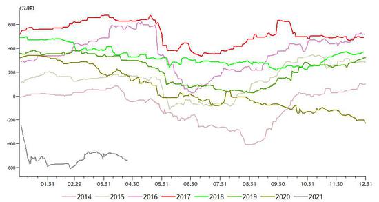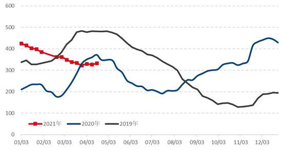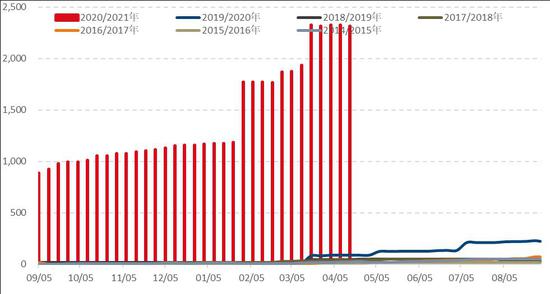 由于国内存在着较大的产需缺口,及国内玉米价格保持在较高的水平,国内进口玉米将大幅增加。根据海关统计,2019/20年进口759万吨,20/21年至3月进口1134万吨,预计全年玉米进口将接近3000万吨。根据USDA的报告,截至4月16日,2020/21市场年度美国共向中国出口销售2313万吨玉米,其中已经装运1012万吨,尚余1301万吨未装运。从进口节奏来看,2月下旬以来美玉米对华装出约300万吨玉米,这些将在4、5月到装,此外去年4、5月到港的乌克兰玉米在149万吨左右,今年预计不会低于上年,由此大致估计4、5月进口到港玉米至少在450万吨,月均在225万吨以上,仍处历史性高位。
