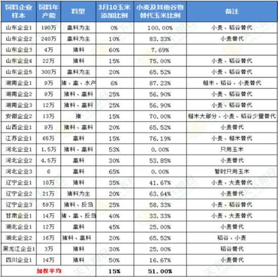 由于玉米价格的快速上涨,玉米相当于小麦等替代性能量类原料的优势正在丧失。由于小麦蛋白含量高于玉米,用小麦还可以减少一部分的豆粕使用,我们简单地以小麦价格与83%的玉米价格及17%的豆粕价格之和进行对比,可以看出,从2020年开始两者的价差就大幅下降,到目前已经达到2011年前后的低位区间,这意味着饲料企业生产饲料时,在能值及蛋白含量不变的情况,使用小麦可以更好的降低成本。实际上,从部分饲料企业的反馈来看,2020年6、7月开始,饲料中小麦的添加比例就在明显上升,到2021年4月,随着玉米进一步上涨,其他谷物对玉米的替代再次加快。根据一份天下粮仓的最新调研,多数样本企业的饲料生产中,小麦对玉米替代比例已经达到一半以上,部分企业开始生产无玉米饲料。另外,政府亦在加大政策性小麦的投放,以满足饲料企业对能量原料的需求。据统计,2020/21年度,小麦累计投放已经近4000万吨,排除面粉厂的消耗及贸易商的囤粮需求,小麦预计可替代掉2500-3000万吨的玉米。除小麦之外,南方地区进口高粱、大麦甚至豌豆也在大量挤占国产玉米的市场份额,根据部分机构的预估,2020/2021年,进口大麦、高粱将可能替代接近1000万吨的玉米。此外,国内陈化稻谷定向拍卖亦在进行中,也将挤占国产玉米的份额。总体来看,国产、政策拍卖及进口替代性谷物将成为补足国产玉米缺口的主力,理想情况下,可替代约近5000万吨的国产玉米。