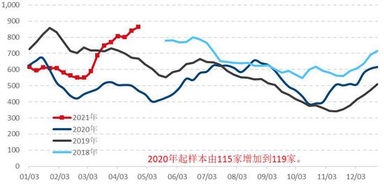 根据天下粮仓的统计,截至到4月16日,北方港口玉米库存为332万吨,呈现企稳状态,主要原因是到港低位稳定而发货减少。南方港口方面,截至4月16日,广东港口玉米库存为90万吨,较3月快速下降,主要因为到港有所减少。根据相关机构的统计,4、5月进口玉米到港会增加,预计止住库存下降幅度。另外,从深加工企业库存的变化来看,3月以来,随着产区基层农户售粮的积极性上升,深加工企业收购明显上量,其库存也快速回升,到4月23日,全国归入统计的119家深加企业的库存已经达到965万吨,较2月的低位增加300万吨,同比来看,亦回到近三年高位。