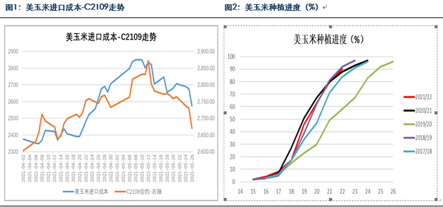 4月份开始因为市场炒作巴西干旱,玉米产量下调,美国低温影响播种及中国大量采购美玉米,带动美玉米期价持续走高,对应着国内进口美玉米成本一路走高,市场炒作进口成本提升带动国内玉米走强的逻辑,国内玉米期价也一路上行。我们从下图美玉米进口成本和C2109期价走势可以看到,它们在4月以来走势高度一致,而到近期随着美国降雨种植进度加快,巴西也将出现急需的降雨,天气炒作结束,期价快速回调打掉天气升水。