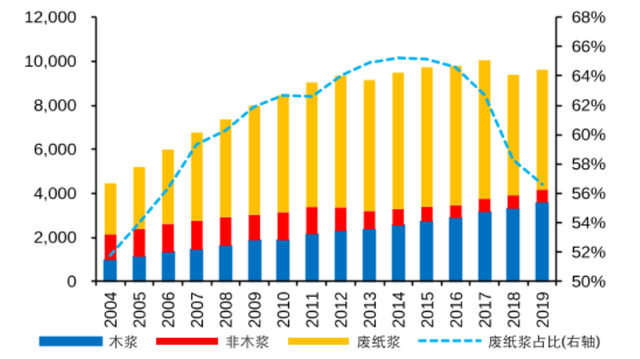 2018年的废纸进口比2017年减少了1/3,2019又比2018年少了40%,,到2020年时,只剩下2017年的30%,也就是说,相比2017年2600万吨的废纸进口量,2020年只剩下800万吨。