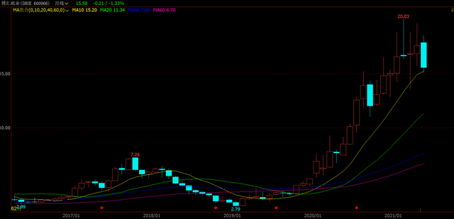 在二级市场,太阳纸业(002078.SZ)、博汇纸业(600966.SH)等文化纸生产商的股票价格也一路飙涨,走出了一波长达近2年的牛市,博汇纸业的股价从2019年中不到3元到2021年初的20元,涨幅正好7倍,吊锤一众科技、医药等优质赛道选手。