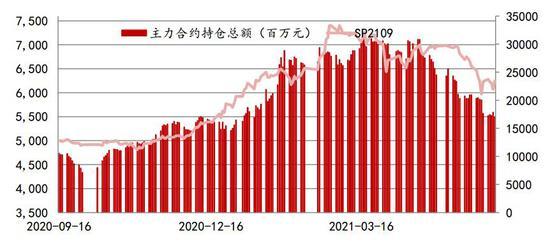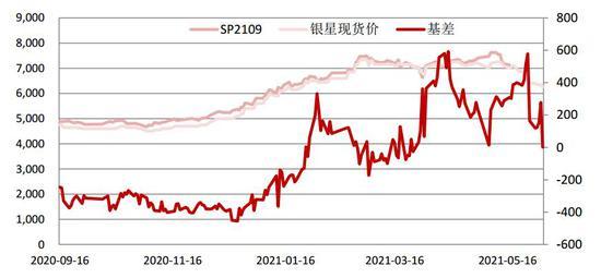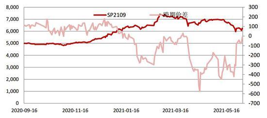 纸浆期货SP2109和SP2106的跨期价差的远弱近强格局逐渐收敛,6月4日收于-12,近月补跌,在5月10日最低曾达到-414。