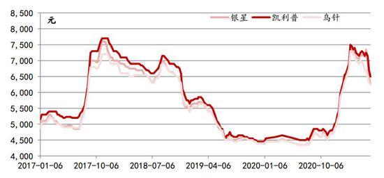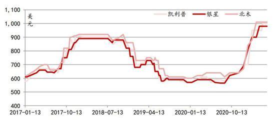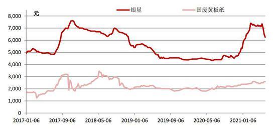 截至6月4日,针叶浆CFR银星报盘980美元/吨,环比持平,同比上升66.1%,凯利普报盘1000美元/吨,环比上升5.3%,同比上升75.4%,北木报盘1010美元/吨,环比持平,同比上升57.8%。本色浆金星报盘850美元/吨,环比持平,同比上升44.6%,阔叶浆明星报盘800美元/吨,环比持平,同比上升68.4%。