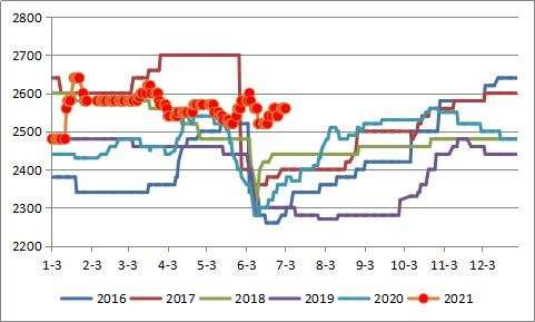 7月国内玉米市场去库存进度和节奏将持续受到新麦上市的供应冲击。进入7月以后,山东、河北小麦收购基本结束,小麦市场抢购热情降温,贸易商出货积极性增加。小麦与玉米价差方面,按照7月初山东临沂地区小麦、玉米价差250元/吨计算,饲料及养殖企业还会积极使用廉价的小麦替代玉米。在贸易商积极销售及华北雨后麦供应增加的情况下,小麦价格区间走弱对玉米也会形成利空拖累。
