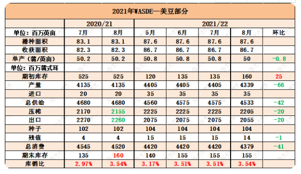 具体来看,8月份,美国2021/2022年度大豆种植面积预期8760万英亩,环比持平;大豆收获面积预期8670万英亩,环比持平;大豆单产预期50蒲式耳/英亩,环比减少0.8蒲式耳/英亩;大豆产量预期43.39亿蒲式耳,环比减少0.66亿蒲式耳;大豆总供应量预期45.33亿蒲式耳,环比减少0.42亿蒲式耳;大豆期末库存预期1.55亿蒲式耳,7月预期为1.55亿蒲式耳,环比持平。