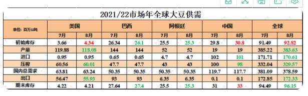 8月份,美国2021/2022年度豆粕产量预期5205万短吨,环比减少45万短吨;总供应量预期5295万短吨,环比减少45万短吨;总消耗量预期5245万短吨,环比减少45万短吨;期末库存预期50万短吨,环比持平。