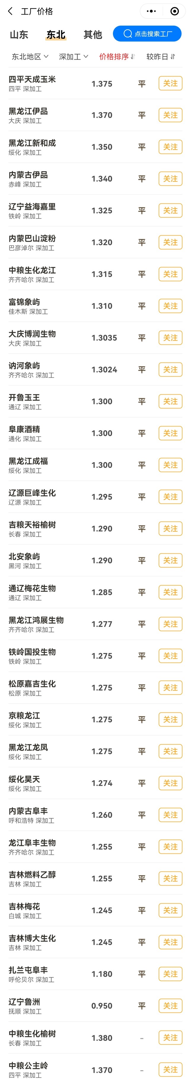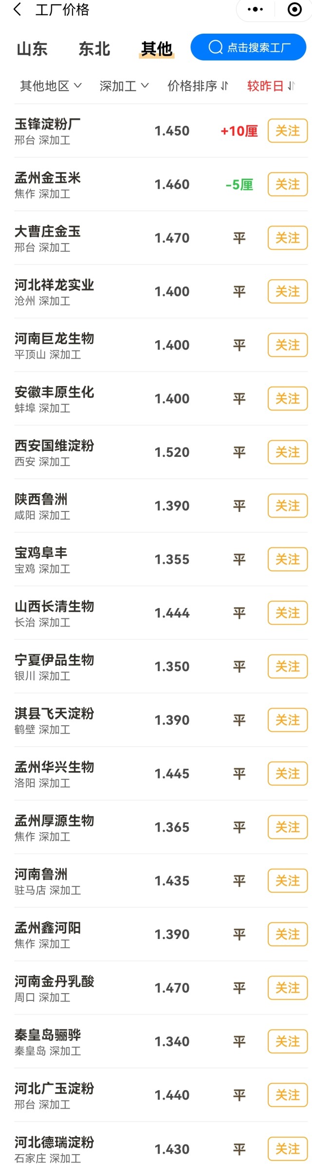 而在华北以及黄淮市场,其他省市,仅有玉峰淀粉报价上涨20元/吨,孟州金玉米报价回落10元/吨,主流工厂报价维持在1.34~1.52元/斤!