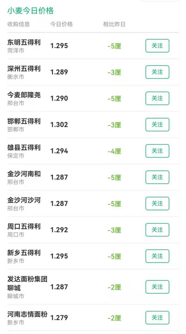 据了解,目前,国内多达10家面粉企业报价呈现4~10元/吨的降幅,具体如下。其中,山东地区,面粉厂家报价维持在1.25~1.335元/斤,其中,临沂青援报价达到1.335元/斤。而在河北市场,工厂报价1.23~1.305元/斤,其中,邯郸五得利以及柏乡五得利报价超过了1.3元/斤。而在河南地区,主流工厂小麦报价1.26~1.3元/斤!