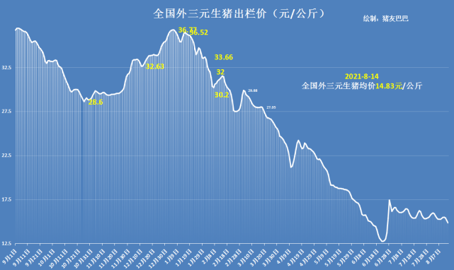 据猪价系统显示,继昨日猪价下挫0.28元/公斤后,8月14日,生猪价格再次走跌,行情跌幅达到了0.27元/公斤,外三元猪价均价跌至14.83元/公斤!猪价“三连跌”,行情下跌表现凸显,目前,猪价同比去年,降幅59.8%!