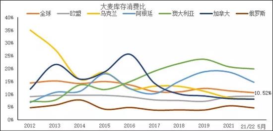 根据7月USDA报告,2021/22年度全球大麦库存消费比为10.52%,同比下降0.73个百分点,分项来看,2021/22年度欧盟、乌克兰、阿根廷、澳大利亚、加拿大、俄罗斯大麦库存消费比分别为:9.2%、8%、14.7%、19.9%、8.0%、4.6%,同样处于历年均值。我国目前进口大麦约为900万吨/年,主要是从加拿大、澳大利亚、乌克兰、法国等区域进口,考虑大麦与其他谷物种植收益比较,认为上述主销国提高大麦种植面积潜力有限。