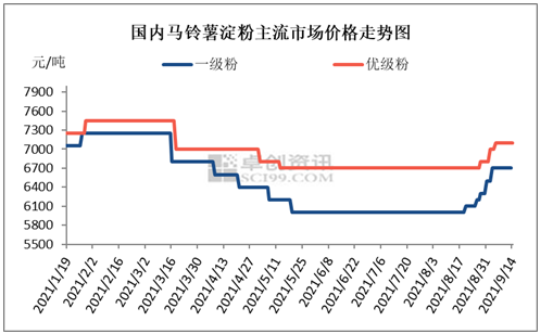 今年原料马铃薯供应量明显减少,随着开工厂家增多,淀粉薯货源供应偏紧,价格居高不下。目前河北地区淀粉薯主流到厂价600-670元/吨,内蒙古地区淀粉薯主流到厂价630-750元/吨,个别价格略高。在厂家集中收购的背景下,短期内淀粉薯价格易涨难跌,若淀粉薯价格走高,或带动马铃薯淀粉显强。