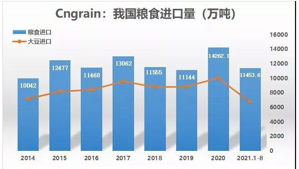 近年来,我国每年进口量过亿吨已成常态。中国海关数据显示,1-8月我国粮食进口量11453.6万吨,去年同期进口8496.7万吨,同比增长34.8%,超过了2019年全年粮食进口量。