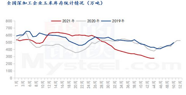 从下游深加工企业玉米库存情况来看,企业库存近期持续下降,根据 Mysteel 玉米团队对全国12个地区,96家主要玉米深加工厂家的最新调查数据显示,2021年第44周,截止11月 3日加工企业玉米库存总量274.2万吨,较上周下降0.6%。虽然深加工企业玉米库存下降,由于上面提到的原因,下游企业通过价格上涨来刺激到货量的效果并不明显,只能继续提价。
