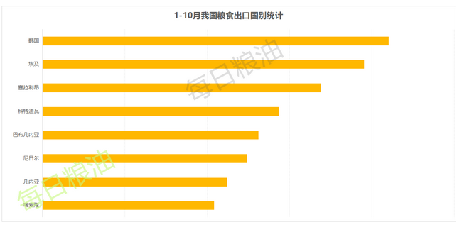 目前,我们统计出的年进口中国粮食超过10万吨的国家主要是韩国、埃及、塞拉利昂、科特迪瓦、巴布几内亚、尼日尔、几内亚和喀麦隆。