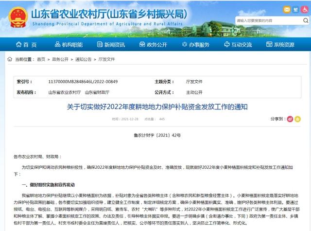 先说山东地区,根据山东省农业农村厅发布的通知,2022年全省耕地地力保护补贴继续以小麦种植面积为依据,按照每亩不低于134元的标准,进行发放补贴,也就是说,山东省种植小麦的农户,每亩可以得到补贴不低于134元。