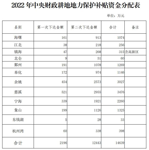 浙江宁波市也发布了2022年度耕地地力保护补贴发放的通知,根据通知中说,补贴经费=耕地地力保护补贴资金规模×(上年度资金规模占比×40%+上年度绩效得分×实际发放面积之积占比× 60%)。公式比较复杂,所涉及到的项目较多,所以没有给出每亩地具体的补贴金额,不过,给出了各个县、区的总补贴金额。