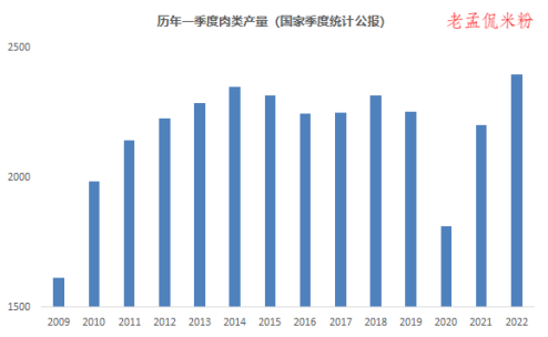 今年一季度肉类产量2395万吨,比曾经的历史最高2014年的2347万吨,增幅2.05%。