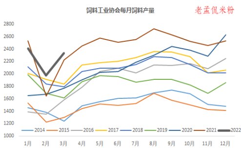 据样本企业数据测算,2022年3月,全国工业饲料总产量2336万吨,环比增长18.3%,同比增长2.4%。