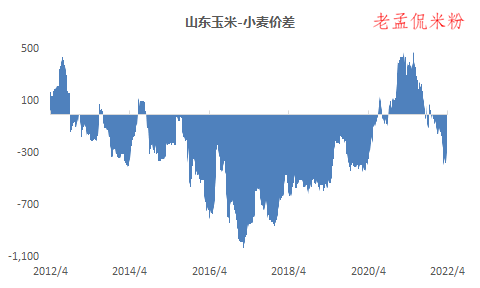 据国粮中心数据,截至2022年4月14日,山东小麦现货价格高于玉米价格340元/吨。