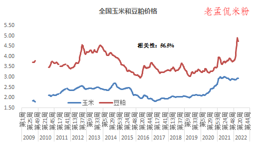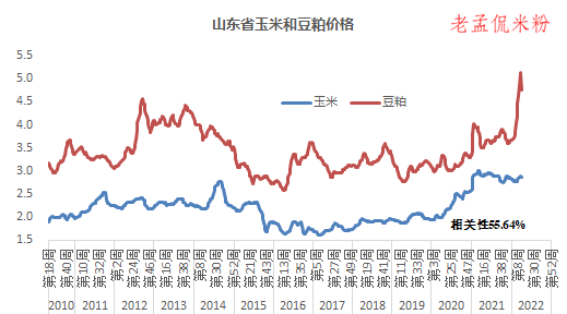 据农业农村部周度畜产品价格测算:全国豆粕、玉米现货价格相关性56.5%;据山东省农业农村厅周度价格数据测算,山东豆粕、玉米现货价格相关性55.64%。