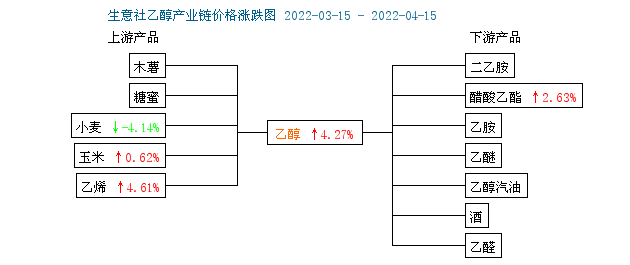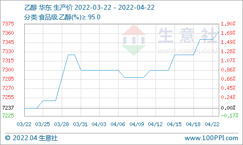 根据生意社监测的样本数据显示,4月15日至22日,国内乙醇市场行情持续小幅上行。周初国内乙醇生产商均价在7325元/吨,周末价格上涨至7362元/吨,周内价格涨幅0.51%,环比上涨1.73%,价格同比上涨9.89%。