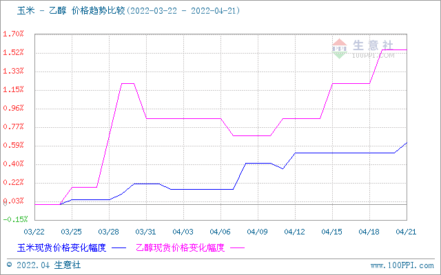 生意社玉米(上游原料)-乙醇价格趋势比较图: