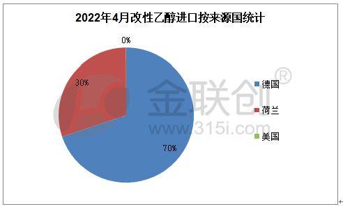 进口国家方面,由上图看出,4月份进口总量按来源国统计分别是:德国3.749吨,占进口总量的70%;荷兰1.612 吨,占进口总量的30%;美国0.003吨,占比微乎其微。4月份,燃料乙醇进口总量整体维持较低水准,主要原因是,国内疫情多点式散发,政府管控较为严格,人们开车出行受限,终端乙醇汽油需求疲软,市场对原料燃料乙醇采购放缓,因此燃料乙醇进口总量维持低位。