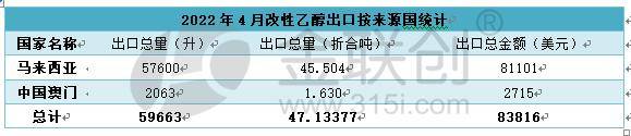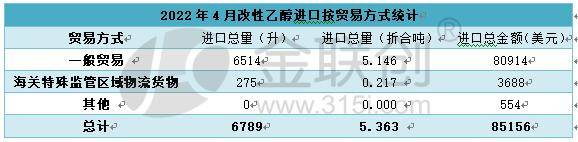 出口国家方面,由上表看出,4月份出口国家主要为马来西亚,出口量为45.504吨,较上月出口量持平。新增出口中国澳门,出口量为1.630吨。出口总量较低主要原因是,受国内疫情影响,终端需求疲软,燃料乙醇厂家出货受限,为缓解自身库存压力,厂家装置多降负运行或停工,市场资源供应缩减,仅供国内炼厂刚需使用,对外流通资源较少。其出口贸易方式主要为一般贸易。