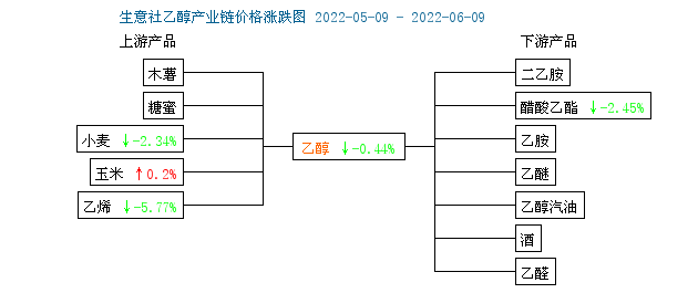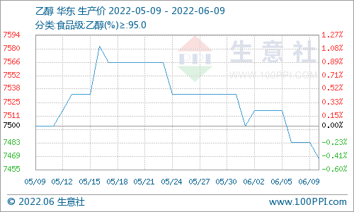 根据生意社监测的样本数据显示,6月2日至9日,国内乙醇市场行情窄幅向下。6月2日国内乙醇生产商均价在7516元/吨,6月9日价格下跌至7466元/吨,周期内价格跌幅0.67%,环比下跌0.44%,价格同比上涨8.61%。