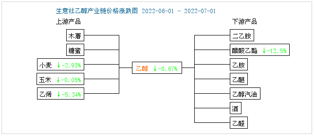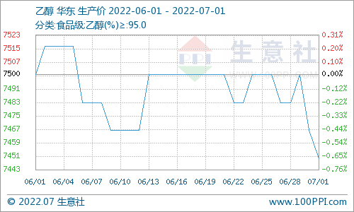 根据生意社监测的样本数据显示,6月24日至7月1日,国内乙醇市场行情低迷整理为主。周初国内乙醇生产商均价维持在7500元/吨,周末价格下跌至4750元/吨,周内跌幅0.67%,环比下跌0.67%,价格同比上涨7.19%。