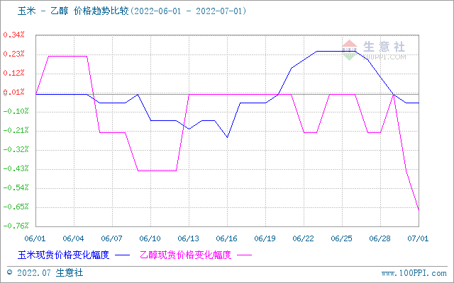 生意社玉米(上游原料)-乙醇价格趋势比较图: