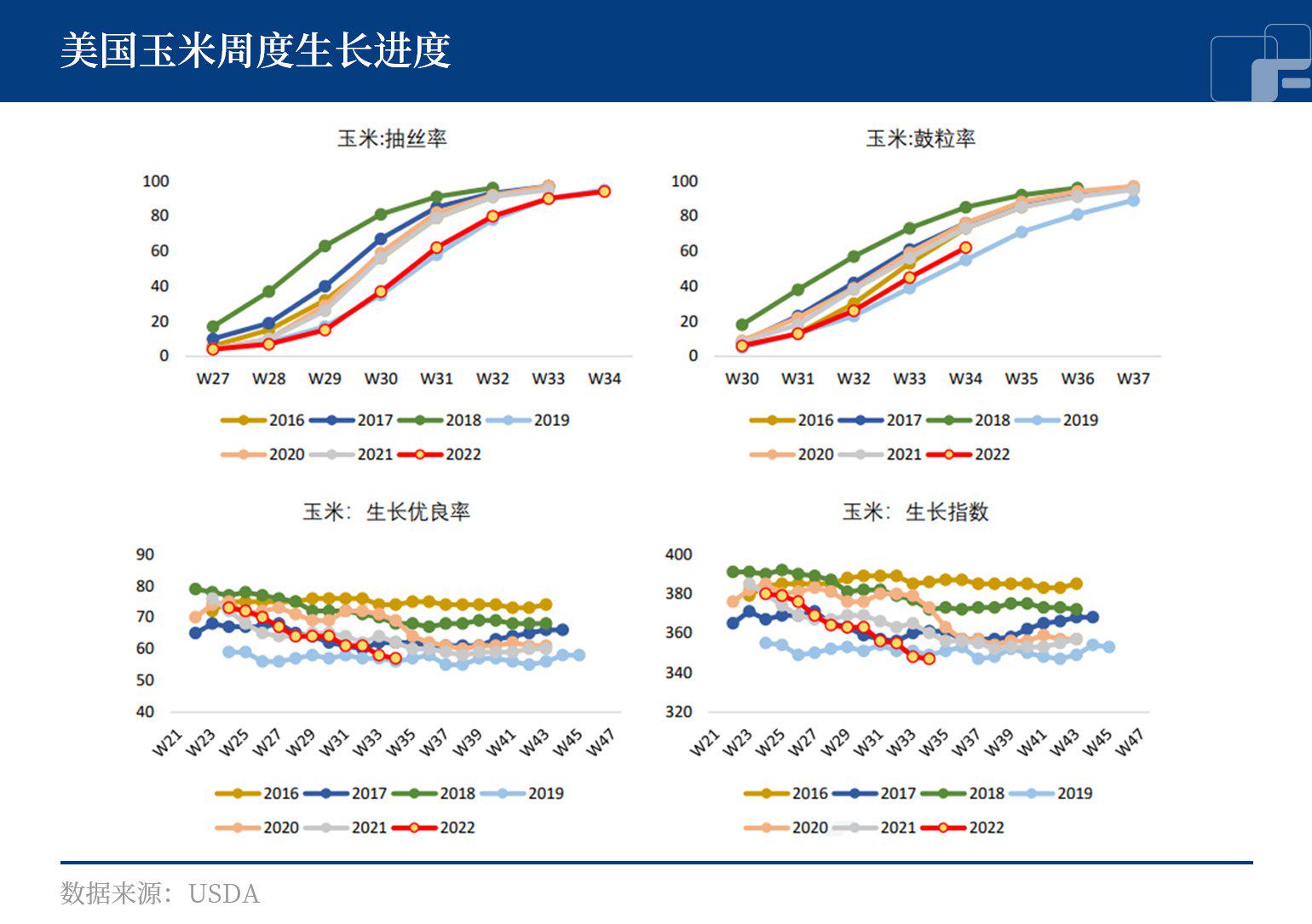 虽然上周美国中西部地区气温转凉,并迎来短期有效降雨,但据美国农业部透露,截至8月16日,美国仍有28%的玉米在经历干旱,大多集中在密西西比河西部地区。美国农业部发布的周度作物进程报告显示,截至8月21日当周,美国玉米作物优良率为55%,低于前一周的57%,亦低于市场预期,去年同期为60%。