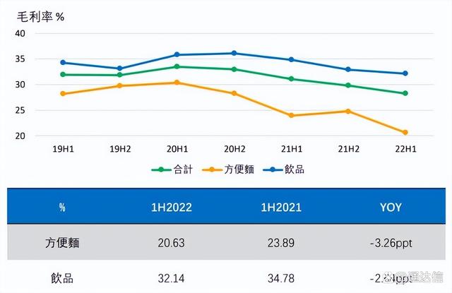 从披露的财报数据来看,上半年康师傅方便面实现盈利5.44亿元,较去年同期的8.96亿元下降39.23%。对此康师傅称,原材料价格上涨是导致方便面业务毛利率、净利润同比下滑的主要原因。