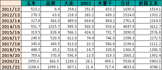 2021年10月到2022年9月,据海关数据统计,我国总计进口玉米2189万吨,进口高粱1099万吨,大麦807万吨,DDGS21.4万吨,木薯干717万吨,合计4834万吨,较去年同期5539万吨低705万吨,降幅为12.7%。