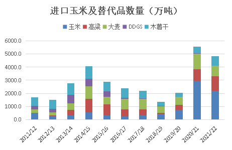 综合以上数据,玉米、高粱、大麦、DDGS、木薯干、干豌豆、碎米,这七个玉米替代品种,在2021/22年度,我国总计进口5370万吨,前一年度总计进口6040万吨,同比减少670万吨,但考虑到2020/21年度进口小麦亦在饲用上替代玉米,因而2021/22年度进口玉米及替代品同比降幅高于670万吨,存在千万吨降幅级别的可能性。