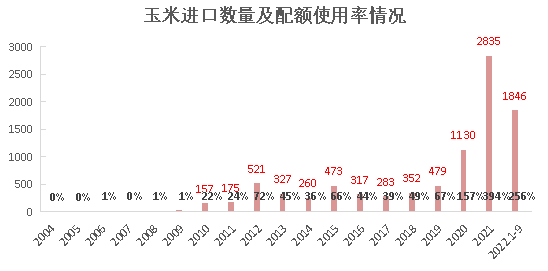 今年10月10日,国家发改委公布了《2023年粮食进口关税配额申请和分配细则》,其中玉米进口配额为720万吨,国营贸易比例60%,与2022年一致。我国玉米进口配额自2004年起至今均为720万吨,玉米进口配额内征收1%的关税,配额外则征收65%的关税。2020年之前我国每年玉米进口的数量均在配额之内,且进口配额的使用率相对较低,2020年开始我国进口玉米数量首次突破配额限制,达到千万吨进口级别。从时间点上看,大量进口玉米也是在2020年初中美签订第一阶段贸易协议之后开始的,同时亦是因为我国临储玉米完成去化,国内当期亦有大量进口玉米的需求,共同导致进口玉米数量激增。2021年玉米进口达到峰值2835万吨,2022年进口量预计已难以超过2021年进口数量,但预计仍将超过2000万吨。