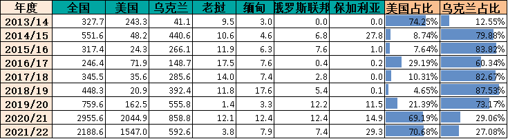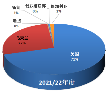 2021/22年度,我国总计进口玉米2188.6万吨,同比减少767万吨,降幅为26%。其中美玉米同比减少497万吨,降幅为24%,今年3月份以来,美玉米理论进口到我国利润长时间处于亏损状态,我国在2021/22年度新增购买美玉米数量极少不足300万吨,多为执行前一年度进口订单。乌克兰玉米进口同比减少31%,主因在于俄乌冲突导致乌克兰玉米出口受阻。今年我国与巴西农业部签署了巴西玉米输华植物检疫要求议定书的修订版,预计新一年度,巴西玉米进口占比有望增加。