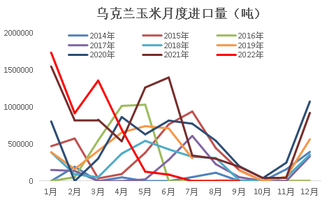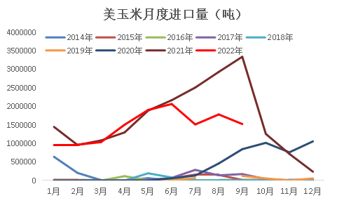 2021/22年度,即2021年10月至2022年9月,我国总计进口玉米2188.6万吨,同比减少767万吨,降幅为26%。其中美玉米同比减少497万吨,降幅为24%,今年3月份以来,美玉米理论进口到我国利润长时间处于亏损状态,我国在2021/22年度新增购买美玉米数量极少不足300万吨,多为执行前一年度进口订单。乌克兰玉米进口同比减少266万吨,降幅为31%,主因在于俄乌冲突导致乌克兰玉米出口受阻,今年第一季度,我国月度进口乌克兰玉米数量均创历史新高,8月份乌克兰虽恢复黑海谷物出口,但出口到我国数量极少,8月份仅210吨,9月份仅1813吨,而今年1月份乌克兰玉米进口173万吨,8-9月份合计仅为1月份进口量的千分之一。