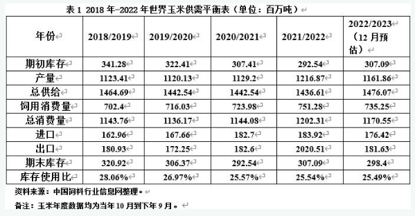 就国际玉米供需调整来看,本月美国农业部预测2022/23年度全球玉米产量继续下调,因为乌克兰、俄罗斯、欧盟和越南的玉米产量调低。乌克兰玉米产量大幅调低的原因在于,持续冲突及创纪录的秋季降雨导致波尔塔瓦、苏梅和切尔卡塞等主产区的收获推迟,导致玉米收获面积和单产下降调。俄罗斯玉米产量降低的原因在于,收割延迟导致收获面积下调。估计2022/23年度全球玉米产量为11.6186亿吨,较上月下调653万吨。本月2022/23年度全球玉米消费下调475万吨至11.706亿吨。本月估计2022/23年度全球玉米期末库存为2.984亿吨,较上月调低了240万吨。主要是乌克兰、巴拉圭、越南和墨西哥的库存下调。