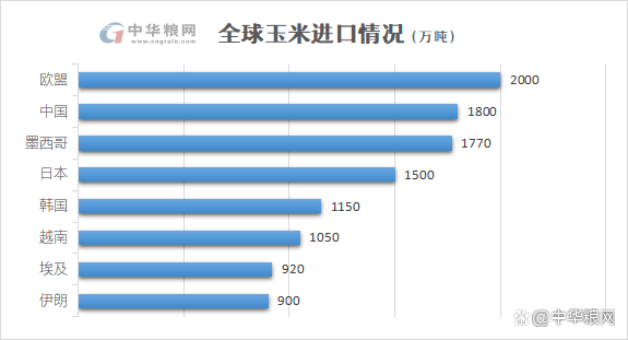 玉米消费主要集中在美国和中国,消费量占全球消费量的一半左右,进口国家主要集中在欧盟和亚洲国家。