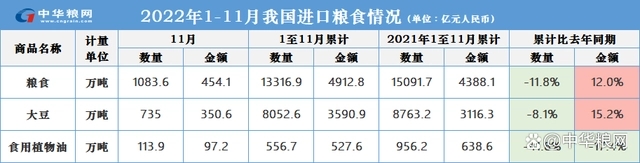 12月7日,海关总署公布最新进口数据:1-11月我国进口粮食13316.9万吨,同比减少11.8%,占2021年全年粮食进口量的81%;进口大豆8052.6万吨,同比减少8.1%,占去年大豆进口量的83%。