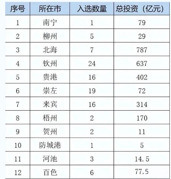 此外,广西其它城市共有20个项目入选,总投资约385亿元。其中,柳州、百色、河池入选项目较多,分别有5个、6个、3个入选,总投资额度分别为28亿元、78亿元、15亿元。柳州主打家装板材这个领域;百色主打木材加工领域,主要布局在田林、田阳、平果等县市,以县域经济为主;河池主打复合板、刨花板等,以县域为主,布局在天峨、东兰、环江等县。此外,梧州、贺州、防城港均有项目入选。玉林和桂林则未发现有项目入选。