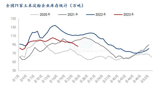 市场供需矛盾有所缓和,也奠定了价格上涨的基础。据Mysteel数据跟踪数据显示,玉米淀粉企业库存连续四周下降,截至6月14日玉米淀粉企业淀粉库存总量85.5万吨,较上周下降3.5万吨,降幅3.88%,月降幅11.07%;年同比降幅23.34%。6月企业库存持续下降的主要原因是5月下游造纸及淀粉糖企业开工环比上升,且多数终端于5月下旬-6月初集中进行了补货动作,6月下游企业集中提货,加速玉米淀粉企业库存下降。玉米淀粉生产企业压力减轻,市场供需矛盾有所缓和,企业提价积极性明显提高。