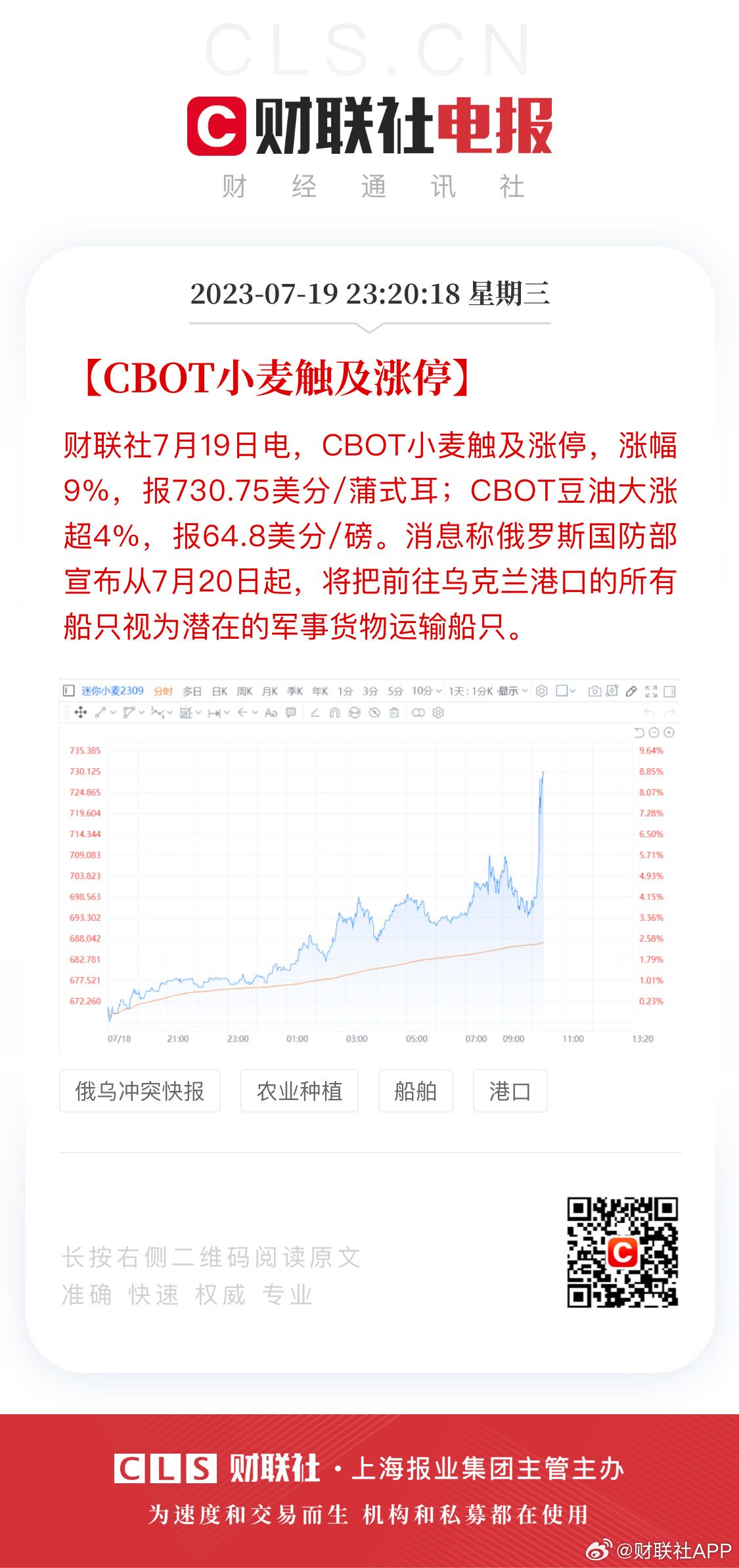 CBOT小麦触及涨停 信息来源:财联社 作者: 更新时间: 2023-07-20 字体大小: 【大】 【中】 【小】 财联社7月19日电,CBOT小麦触及涨停,涨幅9%,报730.75美分/蒲式耳;CBOT豆油大涨超4%,报64.8美分/磅。消息称俄罗斯国防部宣布从7月20日起,将把前往乌克兰港口的所有船只视为潜在的军事货物运输船只。 当前隐藏内容需要支付0元(RNB) 已有 人支付 支付查看 升级会员 上一篇: 重磅!中共中央、国务院关于促进民营经济发 下一篇: 玉米急跌后,突然跌势又变缓了! 相关推荐 快讯2:最新(8.19)凭祥正贸越南淀粉行情......! 最新(9.13)越南各地鲜薯收购价格 CFT供应阶段性趋紧 玉米价格继续回暖 分析预测:本周(8月18—24日)国内木薯淀粉行情走势 淀粉行业上周要闻(8月11-17日) 广西凭祥部分淀粉品牌正贸报价(8.19) CFT终端企业补库较为谨慎 玉米市场行情震荡不止 最新(9.13)越南各地鲜薯收购价格 东兴边贸部分二、三线品牌木薯淀粉报价(8.28) 泰国木薯淀粉在广州经销商的报价(8.28)