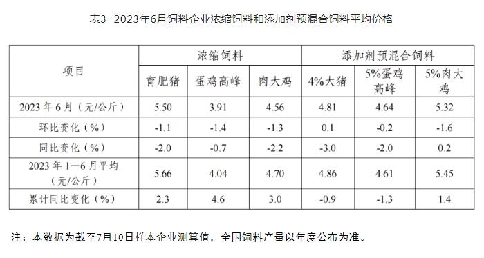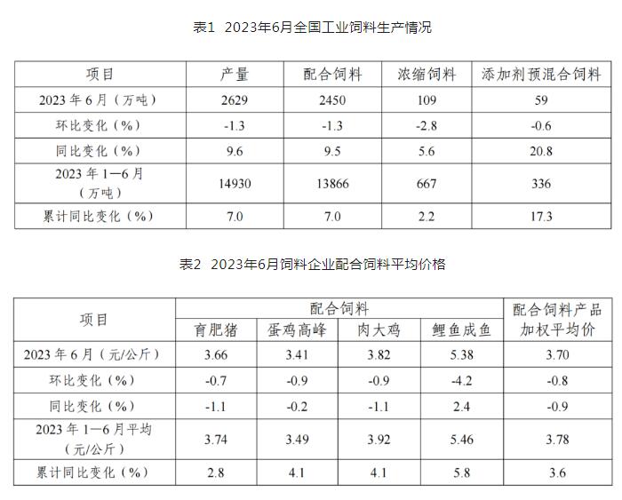 2023年上半年,全国工业饲料总产量14930万吨,同比增长7.0%。其中,配合饲料、浓缩饲料、添加剂预混合饲料产量分别为13866万吨、667万吨、336万吨,同比分别增长7.0%、2.2%、17.3%。主要配合饲料、浓缩饲料、添加剂预混合饲料产品出厂价格同比以增为主。