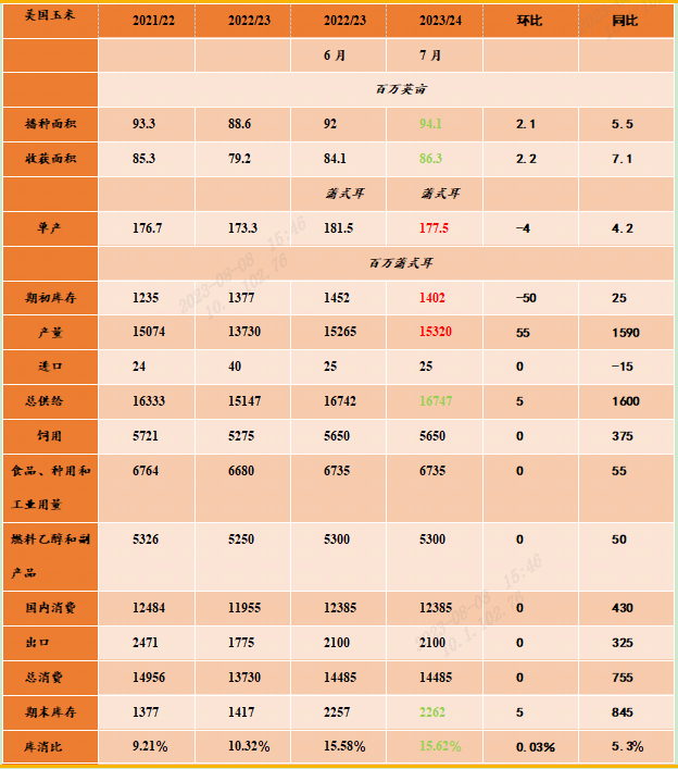 2023年7月供需报告显示,据美国农业部(USDA)预测美国2023年玉米种植面积为9409.6万英亩,同比去年的8857.9万英亩增加6.23%,环比上月预估的9200万英亩增加210万英亩即2.28%。面积调增但单产调降,从上月的181.5调至本月的177.5蒲式耳/英亩,因此产量小增,而需求未变,因此期末库存也只是略增。美玉米当日闻讯小跌,此前6月末面积大增已经在盘面充分反应,因此期价跌幅受限。